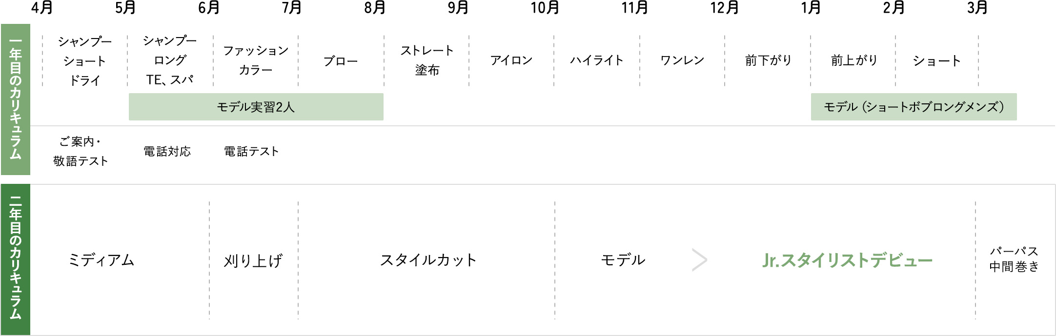 目指せる充実教育リゴッツでは約2年でJr.スタイリストとしてデビューできるカリキュラムを組んでいます。